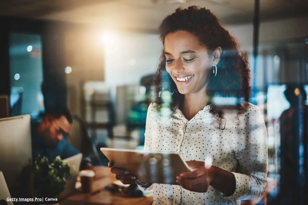 Mujer trabajando en oficina con tableta, representando el talento tech Colombia 2025.